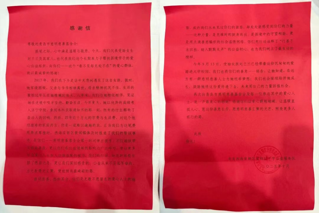 秋意渐浓,天气转凉,慈明慈善基金会却因一份深情的“谢礼”而暖意融融。一封沉甸甸的感谢信,与一面写有“慈心助学情暖学子 善举济困爱满岛城”的锦旗,送到我们手中。